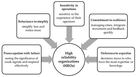 The concept of HROs originated from a team of researchers at the University of California, Berkeley, in 1984, who argued that error-free performance is created by an active search for reliability [18]. They noted that three organizations (i.e., the US Air Traffic Control system; Diablo Canyon, an electric company that operates a nuclear power station and an electricity distribution system; and the US Navy nuclear aircraft carrier operations) operate effectively in complex technical environments where their errors could have destructive effects. HROs are organizations that operate in complex, highly risky areas and potentially must cope with catastrophic consequences when failures occur. Weick and Roberts suggest that HROs have accomplished collective mental processes, including information processes, heedful action, and mindful attention. They propose the concept of a collective mind and argue that increased attentiveness and mindful comprehension decrease the likelihood of errors in an organization [19]. Weick et al. created a mindfulness infrastructure at the level of collective or organizational mindfulness. The theory of HROs points to mindfulness as the infrastructure of HROs. High-reliability organizations attempt to be error-free under complex and high-risk systems. They argue that the success of HROs lies in handling unexpected events by acting mindfully; that is, organizations are better able to notice unpredictable events, develop, focus on containing and resilience, and quickly recover from system functioning [9,20,21]. Figure 1 presents the five key characteristics of HROs.