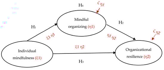 Figure 3 shows a path diagram for the causal relationships between the three constructs in enhancing organizational resilience: individual mindfulness (ξ1), mindful organizing (η1), and organizational resilience (η2). Mindful organizing and organizational resilience are endogenous latent variables, while individual mindfulness is an exogenous latent variable. The SEM for this mediation model is given by:
