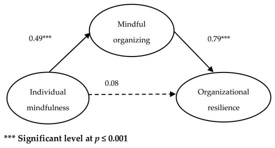 From the significant direct effects found in H1 and H2, we further examined the mediating role of mindful organizing on the relationship between individual mindfulness and organizational resilience (H4). The mediating effect refers to a situation where a third variable intervenes between two associated constructs [45]. Before the SEM process, the conditions to claim the occurrence of mediation were tested [46]. In SEM, Hair et al. suggested the following steps for testing mediation [47]. We tested the first model by estimating the direct effect between individual mindfulness and organizational resilience. The result was positive and significant (β = 0.44, p < 0.01). We then tested a second model by adding mindful organizing to the first model. After adding mindful organizing to a model, the standard coefficient beta of the relationship between individual mindfulness and organizational resilience was not statistically significant and was close to zero (β = 0.08, p = 0.284). Therefore, potentially, mindful organizing fully mediates the path between individual mindfulness and organizational resilience, meaning H4 is supported.