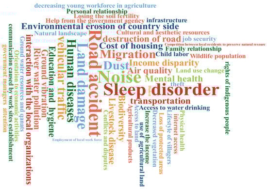 Table 1 shows the demographic information of participants in the present study. After the primary coding of the interviews and determining the significant units, a total number of 62 primary codes were extracted. The frequency of the extracted codes was demonstrated as a cloud diagram (Figure 3). The primary codes included road accidents, sleep disorder, and noise with six repetitions, which had the highest importance. While dust, lifestyle changes, the safety of properties and assets, change in management of the village, and job satisfaction had the minimum importance among the extracted codes, with only one repetition.