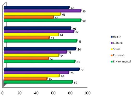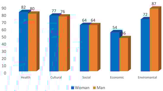According to the results displayed in Figure 4, the mean score of expressed opinions by the women, in the studied sample, is higher than the men’s perspective in terms of health, cultural, social, and economic outcomes due to the mining activities. On the other hand, the mean score of men is higher than women in terms of the environmental dimension. Men mostly believe that mining activities have affected the environment of their living area.