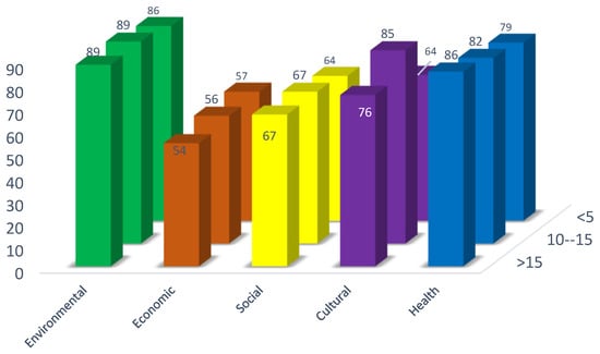 According to Figure 6, the mean score of the individuals with greater records of residence in areas close to the mines shows a higher value for environmental, health, and social indicators in comparison to individuals with lower records of residence. On the other hand, the outcomes in the economic index give opposite results, individuals with lower records of residence feel less about the negative economic outcomes. On the other hand, the cultural outcomes due to mining activities for the individuals with residence records between 10 and 15 years are greater concerning the two other groups.