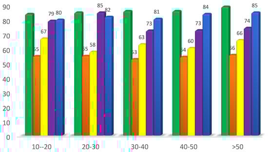 Comparing the mean scores of sustainable development indicators in terms of the age groups (Figure 7) shows that the higher age groups, concerning lower age individuals, believe that the mining activities had the greatest impacts on the environmental and health indicators. The mean of cultural outcomes related to mining activities at the lower age groups is greater concerning other age groups. On the other hand, the age groups between 10 and 20 years, and also higher than 50 years, believe that the presence of a mine close to their village not only had not caused economic productivity for them but it had a negative impact on their economy.