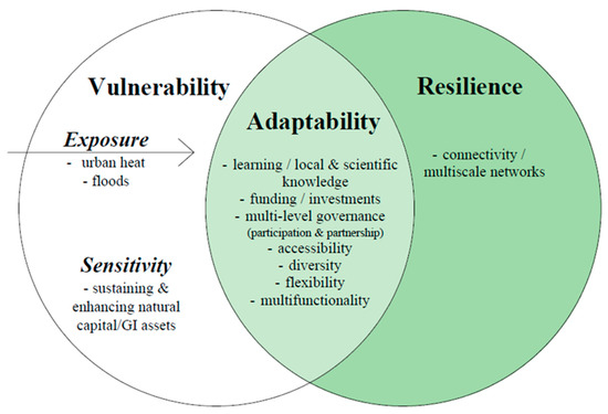 A comparison among the four key concepts (Table 3, Table 4, Table 5 and Table 6) reveals that, apart from the determinant “identity/local distinctiveness”, all the documented GI determinants are in line with those that enhance resilience and adaptability while reducing vulnerability (Figure 1). This comparison also highlights that all the concepts are influenced by all forms of capital along with the system of governance and planning, although only in the theory of adaptability are there direct mentions. Regarding the cross-cutting domain, accessibility and diversity emerge as common determinants of all the concepts. Flexibility and multifunctionality in GI planning appears to enhance resilience and adaptability while connectivity is only correlated with resilience and GI planning.