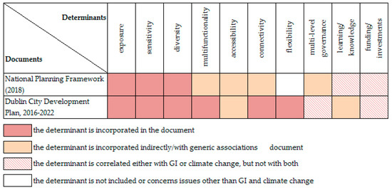 In addition to the dimension of physical planning, the tool also incorporates the dimension of institutions and governance. Multi-level governance could be examined through provisions regarding vertical and horizontal dimensions of governance. It therefore concerns, whether and to what extent higher and lower levels of stakeholders/partners and agencies contribute to the planning process and the implementation of projects and actions related to GI for adaptation. In the NPF, there is a correlation of the characteristic of multi-level governance, in terms of cooperation and participation, with GI (e.g., cross-border cooperation for the development of blueways and greenways) but not with the primary effects of climate change. DCDP promotes cooperation regarding climate change (e.g., coordinated response and cooperation between public bodies to manage and deal with flood risk) and GI (e.g., participation/consultation in the development of river walks and cycleways), but there is not a correlation between them, i.e., cooperation and participation is not encouraged for adaptation through GI.