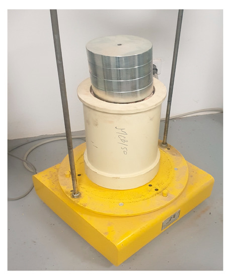 To measure the compactness of sand and gravel, a precise quantity (7.5 kg of gravel and 3 kg of sand) is vibrated in a sieve shaker for 1 min under a pressure of 10 kPa applied by a steel piston (Figure 5). Then, the final volume is measured in both cases [23]. Equations (8) and (9) express the elementary compactness of sand Cs and gravel Cg.
