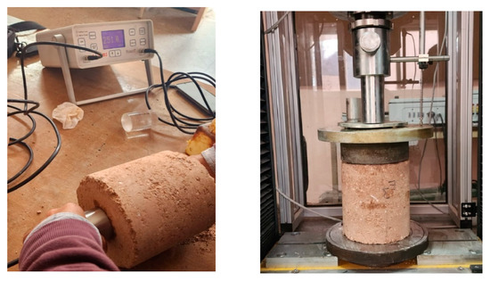 An ultrasonic pulse velocity (UV) test is conducted on each specimen to measure the ultrasonic pulse velocity (acc.to NF EN 12504-4 [37]). The test is carried out by direct transmission to the transducer faces and the specimen surfaces (Figure 7). Materials with a lower UV have lower density and strength. The objective of this test is to compare the UV of E2 and E3 samples and predict their stiffness and compressive strength.