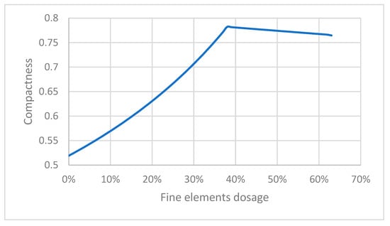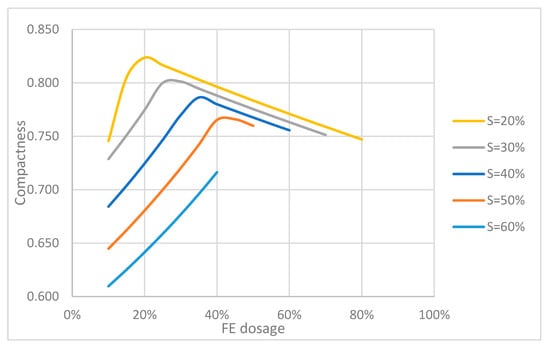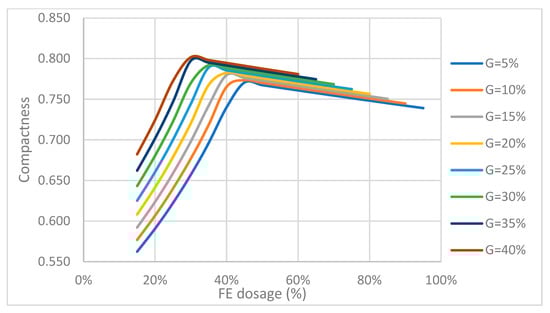 The first simulation consists of fixing sand dosage and varying FE and gravel dosage. As is shown in Figure 8, the optimum FE (FEopt) dosage that ensures the maximum compactness depends on the sand dosage. Compactness is lower when the sand dosage is higher and FEopt takes higher values. The granular structure contains less gravel, and its stiffness and compactness are, therefore, lower.