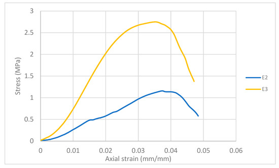 The found UCS of the E2 samples is 1.16 MPa, while the found UCS of the optimized E3 samples is 2.75 MPa. The stress–strain curves of both samples are presented in Figure 11. This result means that the granular correction enables the enhancement of the UCS by 137% without adding stabilizers such as cement or lime.