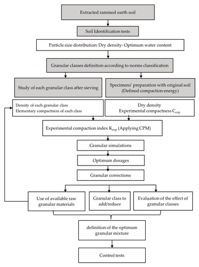 - A general workflow, proposed in Figure 12, can be applied to design an optimized granular mixture according to the CPM.