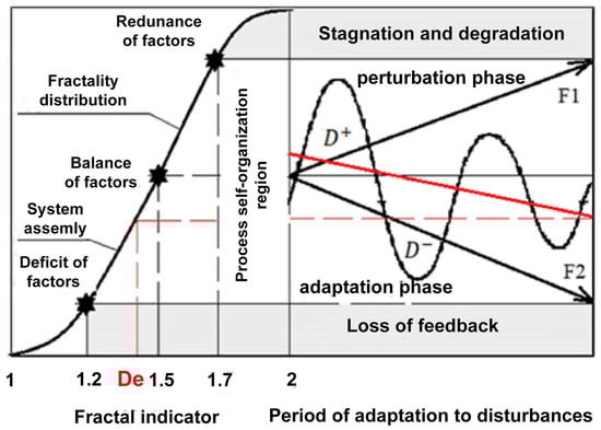 - As a self-similar structure, the fractal makes it possible to quantify the nature of coevolution (proportionality) of two opposites—anthropogenic and natural components—throughout the studied time interval as a change of the ecosystem morphology. It is indicative that the ecosystem degeneration connected with the “environment-object” relation antagonism is directly related to the loss of its fractality at the integer values of D = 1 and D = 2 for which the coevolution of components is completely lost. Thus, violation of the coevolution is stronger, the higher the value of D, and it is accompanied by an increase in the difference between the current and optimal parameters of the ecosystem; for the optimum, the fractal indicator is D = 1.5 (Hurst constant H = 0.5) (Figure 1).