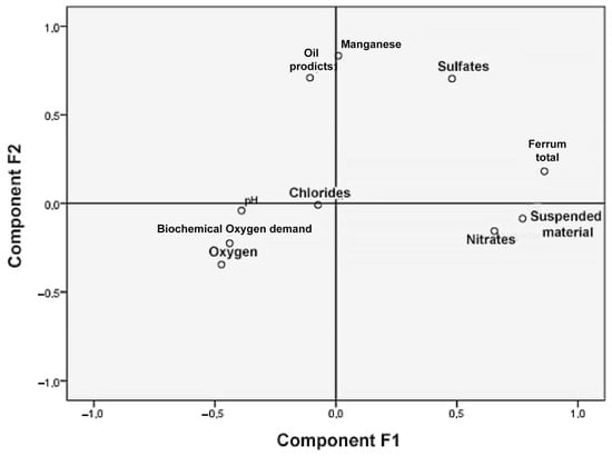 In order to convert the calculation data into the factor load coordinate system, we used the “Main component method” function of the SPSS program. This allowed us to carry out a morphological analysis of the water ecosystem by constructing the analyzed data projections in the binary system of variables; where F1 is a component of the positive correlations between the variables showing the ecosystem pollution growth by increasing the intensity of water use; and F2 is a component of the negative correlations between the variables, showing the opportunity to structure the ecosystem by reproducing biological resources.