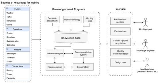 AI-based models have been used in different studies in the MaaS domain to, e.g., classify driving styles or vehicle path prediction using trajectory data. The classification algorithms can customize driver assistance systems and assess mobility, crash risk, fuel consumption, or emissions. For example, Mohammadnazar et al. [11] extracted volatility measures based on speed, lateral longitudinal acceleration, and temporal driving volatility (using a 3-s time-frame window) from a set of data and used them for cluster drivers (in aggressive, normal, and calm) using K-means and K-medoids methods. In another study, Carpatorea et al. [12] proposed a machine learning methodology for quantifying and qualifying driver performance, concerning fuel consumption, based on naturalistic driving data. In a recent study [13], two ensemble learning algorithms (random forests and AdaBoost) were used to predict the traffic intensity before vehicles reach the intersection. The vehicle trajectory data were collected from GPS sensors, longitudinal, lateral, and yaw motion, heading and speed of automobile movements. The vehicles with similar conditions were clustered to provide a route planner to users. In terms of traffic flow prediction, Li and Xu [14] developed a short-term traffic flow prediction model based on Support Vector Regression (SVR) to improve the accuracy of traffic flow prediction systems on the California Highway Performance Evaluation System (PeMS) videos. Abdellaoui et al. [15] proposed an automatic management system in bike sharing, which can predict the number of bikes shared per hour, day or month by taking several dynamic parameters using a Random Forest regressor. Another interesting perspective of the MaaS system is proposed in [16], which is a study conducted based on the Santa Clara transit system. The report evaluates the financial feasibility of integrating public and private transportation systems and further extends to developing a method to infer missing data. Citing [17], the study provides insight into using a crowd-sensing model for optimizing urban transportation problems. They developed a prototype and demonstrated use cases to include accessible transportation models. In regard to the recommendation system in MaaS, a plan recommendation system using constraint programming and similarity metrics was presented in [18] to support the MaaS end-users. The recommender was used to identify the mobility plans that fit the transportation needs and rank filtered mobility plans. Despite the numerous studies applying AI-based methods [19,20,21], a few of them considered knowledge-based systems to provide personalized mobility services. Notably, Arnaoutaki et al. [22], proposed a hybrid knowledge-based system that uses constraint programming mechanisms to provide mobility plans to travellers based on their preferences and exclude the routes that do not match those preferences. Similar to this study and in conjunction with the other AI-based models, we propose a knowledge-based AI mobility framework that utilizes context information and knowledge of mobility (acquired from travellers and vehicles) to provide personalized mobility services while being interpretable and explainable for both travellers and domain experts. Our proposed framework covers the profile preferences of travellers and other stakeholders and explains why such recommendations and personalized services are provided to them.