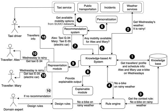 We implemented a scenario (depicted in Figure 2) using a simulated dataset and contextual data. In this scenario, two travellers, Alex and Mary, typically use e-bikes on Wednesdays. However, the system notices that next Wednesday will be rainy, based on weather forecast data. The AI system uses a rule engine and concludes that travellers cannot ride e-bikes in rainy weather and recommends an alternative, a personalized transportation solution, to each traveller. According to the knowledge base, Mary is interested in sustainable transportation and prefers using electric cars, while Alex likes gas automobiles. Then, the AI system searches the taxi drivers in Mary’s area and arranges a taxi service with an electric car for her. It also suggests a gas car to Alex according to his location. Both travellers are connected to the corresponding taxi drivers. While providing recommendations to them, the AI justifies each suggestion, using the explainability module to build trust. If no taxi drivers are available for these travellers, the AI system might not provide any recommendations to them and notifies the domain expert or knowledge engineer that a new rule should be added to the system to expand its functionality. When the mobility expert receives a notification regarding the inability to provide suitable recommendations, they may define a new rule in the system to recommend other modes of transportation (for example, public transportation) to the travellers in case of a lack of taxi services in the area. Figure 2 illustrates this scenario.