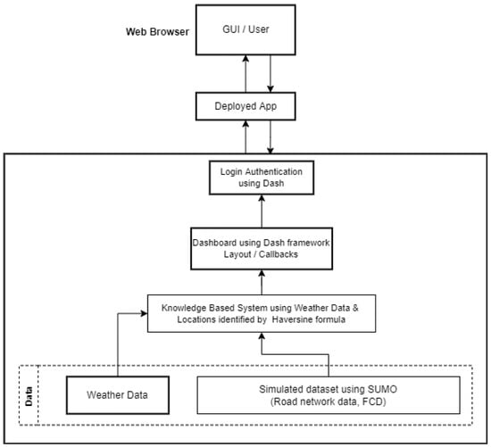 The weather-based mobility solution is built using Python and its libraries (https://www.python.org/, accessed on 30 January 2023) The traffic data used in this study is the outcome of running a 24-h traffic simulation of Monaco City developed by [35]. This simulated dataset was created based on a research project to develop a solution for Cooperative Intelligent Transportation Systems (C-ITS) using a traffic simulator. SUMO (Simulation of Urban Mobility) (https://sumo.dlr.de/docs/SUMO_at_a_Glance.html, accessed on 30 January 2023) is a multimodal and microscopic traffic simulation program designed to handle massive networks. Numerous datasets can be generated using SUMO comprising information on city roadways, taken primarily from OpenStreetMap, as well as other pertinent synthetic data pertaining to various traffic flows, including passenger vehicles, pedestrians, Mopeds, bicycles, buses, and trains. In our experiments, the “road network data set” extracted from SUMO is among the used datasets listed in Table 1. To combine the road data with the floating car data, we identify the vehicle’s lanes and obtain the road coordinates from the road network dataset by using laneID.