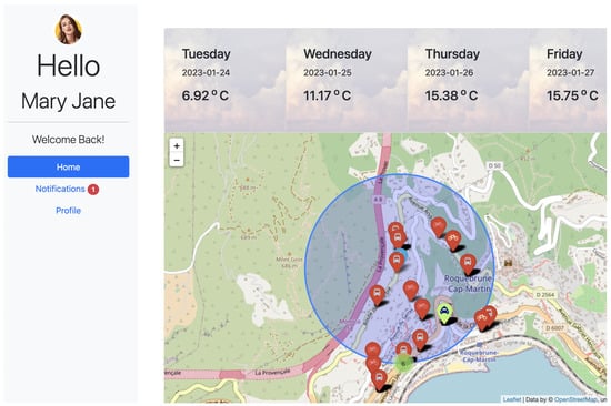 Once the vehicles are identified, a personalized dashboard (see Figure 4) is built for each user (i.e., Mary and Alex) to observe the weather condition and help choose the closest vehicles to her/his location on a map (depicted in Figure 5). A geographical visualization is shown in the dashboard to explain why those vehicles are recommended to users. We also created a notifications page to allow travellers to see the weather alert and a list of available vehicles to book. Users can book a ride from any of the available cars. For this particular case study we considered the closest vehicles to the passenger considering their preferences. In addition, we can also consider other parameters such as shortest travel path or fastest mode of transport, or accommodate route preferences.