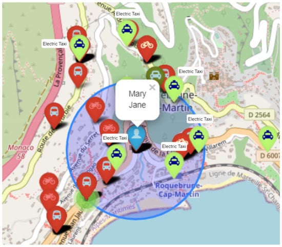 Visualization of Mary Jane and vehicles in proximity. Electric taxis are marked as light-green markers. Vehicles that are in the proximity but not aligned with Mary’s preference are red markers.
