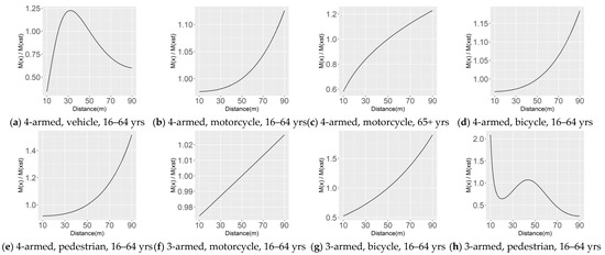 - The other exception was the model for [vehicle-to-pedestrian accidents at three-armed junctions with the other party aged 16–64], which followed a cubic function with one valley or the lowest risk at 20 m and one peak or the highest risk at 43 m.