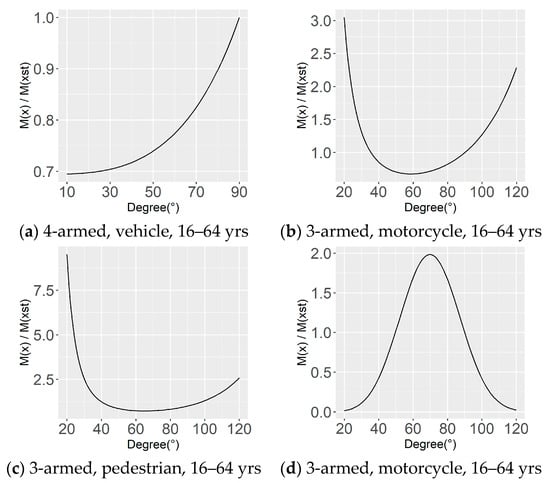 - For the models of [vehicle-to-motorcycle accidents at three-armed junctions with the motorcyclist aged 16–64 years old] and [vehicle-to-bicycle accidents at three-armed junctions with the motorcyclist aged 16–64 years old], a U-shaped curve was derived with the lowest risk of fatal/serious accidents at the junction angles of 59 degrees and 65 degrees, respectively.