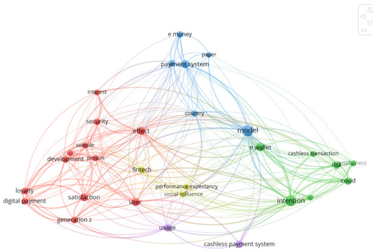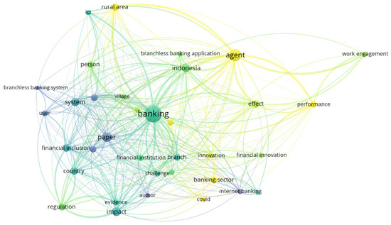 In Figure 8, the network visualization shows the network between terms, which is visualized based on research on branchless banking in Indonesia in general. The discussion on branchless banking is closely related to several key terms, such as fintech, payment systems, e-money, performance expectancy, models, e-wallets, and cashless payment systems. Bank officials have effectively bridged the gap between banks and the unbanked masses in urban, and even rural, communities, relevant to [66]. These MCRB officers can act as bank representatives and can play a leading role in promoting financial inclusion [63]. Some of the benefits of branchless banking are: (1) a better image of the institution in various strata of society. Branchless banking offers an extraordinary opportunity to service institutions in a way that creates a simple, familiar, and interactive business image. In branchless banking, the institution, through its officers, can assure customers of the transparency of the MCRB; (2) customer understanding is formed and improved, and branchless banking allows banks directly at the customer’s location by maintaining health protocols. MCRB customers do not have to wait in long queues to access banking services. Customers are routinely visited by officers to carry out banking operations, with clear product presentation, fast integration process, and demonstration of the latest features that can drive better financial literacy for customers. In addition, customers already know the officers well, thereby minimizing doubts about conducting banking transactions, creating trust [67] in the minds of customers; (3) guaranteed security [68] that is fast and systematic because the mechanism created requires bank officers to synchronize with a centralized system in the office after officers make visits to customers for customer banking transaction needs; (4) easily accessible for customers. With the branchless banking application, customers can easily withdraw, even though the amount is limited, and deposit money from the customer’s bank account, which is legalized [69] with printed evidence in the form of a receipt via a portable printer brought by a bank officer following the applicable commercial rules; (5) the object of financial literacy is wider in scope because it can serve the population of people who do not have bank accounts, disabilities, and people who do not have smartphones. The branchless banking practice carried out by MCRB, in the perspective of innovation [70], is also one of enrichment of innovation in financial inclusion.