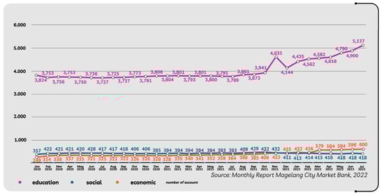 Meanwhile, for the community, as customers who are the target of branchless banking in Magelang City, there are potential economic resources in the form of five traditional markets with a total of 4423 market traders; nineteen culinary centers with a total of 532 small traders; and 8000 SME players who contribute to the economic growth and development of the City of Magelang [50] and require fast and efficient financial transaction services. At the level of implementation of branchless banking socialization, it is carried out informally with a mechanism; bank officers visit prospective customers at locations where customers are located, and a user-friendly system provides convenience in the transaction process. Transaction facilities that can be accessed are in the form of transactions for depositing and withdrawing savings, paying installments for customers who have loans, and developing credit facilities. For the saving process, the customer is not limited in the amount, but to make savings, the customer is limited to a maximum of two to three million IDR, due to security reasons for bank officers when carrying money in cash and referring to the rules that have been standardized in Indonesia. There are eight bank officers deployed to pick up transactions for customers who provide services to the 6202 registered account numbers and the 2536 active account numbers. The classification of customers who access the service is divided into students, with as many as 1386 account numbers; small traders, with fifty-seven account numbers; market traders, with 207 account numbers; and general traders, with 886 account numbers.