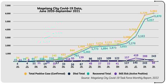 The description of the COVID-19 pandemic in Magelang City refers to the Magelang City COVID-19 Task Force based on the number of victims categorized as “total positive cases” (confirmed), namely the number of victims who have been declared infected; “total deaths” is the number of victims who died due to COVID-19; “fully recovered” is the number of people who have contracted COVID-19 but have been declared negative after undergoing self-isolation and/or isolation from the Magelang City local government; and “still sick (active positive)” is the number of victims who are struggling to recover from COVID-19.