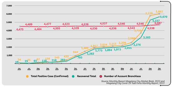 COVID-19 data refer to sources from the Magelang City COVID-19 Task Force after tabulation, a description of which can be narrated for sixteen months. At the beginning of the recording (from the end of December 2019 to May 2020), coordination and institutional formation were still being carried out, until it became the Magelang City COVID-19 Task Force, so complete data was not yet available. Meanwhile, after July 2021, there was a decrease in COVID-19 victims, and vaccinations for the community were carried out, so the government shifted its focus from handling COVID-19 to economic recovery. As a result, the data is current until September 2021. An analysis was performed through a description of the data obtained, followed by a comparison of the accumulation of savers in branchless banking and the number of positive (confirmed) and recovered cases from COVID-19, and concluded at the end of this study with recommendations that can be used as an option for branchless banking management.