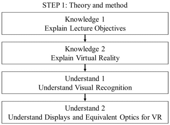 Step 1 introduces the theories and methods for developing an understanding of VR from a hardware perspective in the course, which progresses for 3 weeks (20%) of the total 15-week process. Figure 1 shows the sequence of step 1 objectives in the VR course.
