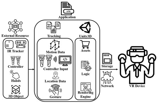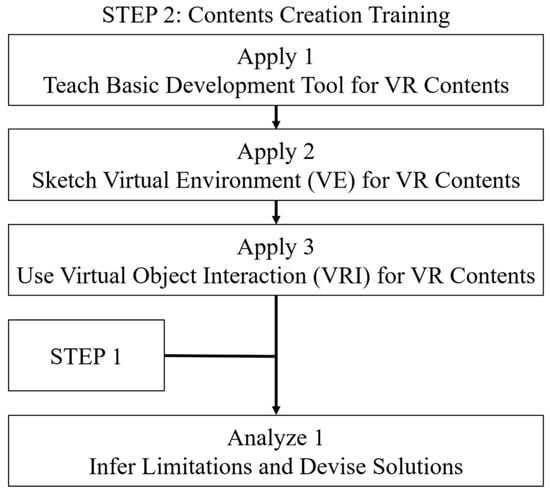 In step 2, the TA leads a practical course on the primary technologies required for VR content creation while the team project is in progress from a software point of view. Before the course started, the instructor provided students with a personalized VR device (Oculus Quest 2) for practice and project progress. The students were guided to fully understand the VR environment through device experience and to take the initiative based on their experience in advancing practical training and projects in the future. In this paper, we configured the components needed to create VR content, as shown in Figure 2.