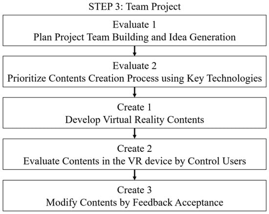Step 3 involves proceeding with a team project based on what the student has learned through theory and practice, which is equivalent to seven weeks (47%) of the 15-week process. Figure 4 shows the sequence of step 3 objectives in the VR course.