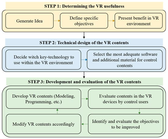 Vergara et al. have spent many years researching the software and development sequence for building virtual reality learning environments (VRLEs) [,,]. This study defined a general-purpose content design method that constitutes VRLE modified to modernize Pantelidis’s method []. This study confirmed that it has reached its goal and made the necessary corrections. This process provides guidelines in many VR education systems, and this method is modified and used in this paper.