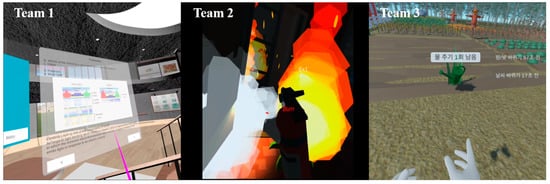 Captured image of team project results from nine students (Team 1: Virtual classroom for understanding LCD and OLED Structure, Team 2: Virtual simulation of fire drill, and Team 3: Virtual interaction farm).
