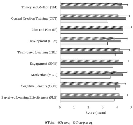 In the case of Perceived Learning Effectiveness (M = 4.13, SD = 0.57), the P group showed positive educational effects for students overall. In particular, they replied that this course was meaningful, expressed confidence in identifying and summarizing the main content of what they had learned, and were interested and inspired to learn more. This result shows that students can actively accept new information and organize their knowledge. In the case of the NP group, lower scores and even distribution results were shown for the overall courses compared to the comparative group. In particular, they showed confidence that they could put together the course content. This result confirmed that they had difficulties in the application process but they could actively construct the learned knowledge. In short, the process of introducing the theory and overall skills was well communicated to all students, but the practical and team-project courses seemed to be a bit lacking in practice time and content for the NP group.