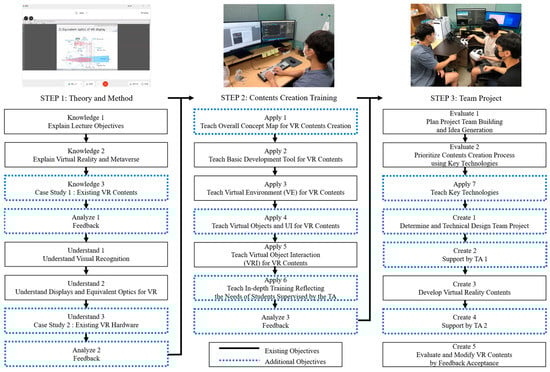 The total amount of time is 60 h during the semester (15 weeks). The prerequisites for this course include display engineering to technically understand VR hardware and OOP to understand software for developing programs. However, since there are no restrictions on attendance depending on the elected subjects, essential content for students to proceed with the team project was provided in the theoretical and practical training process to proceed with the course. All students who attend the course are graduate students and meet the minimum prerequisites for advancing a project on a particular subject through the majors they take in their undergraduate studies and the comprehensive design tasks over two semesters for graduation. The VR course proposed was designed in three steps according to Bloom’s taxonomy, which has six levels. Details about each step are provided in the next section.