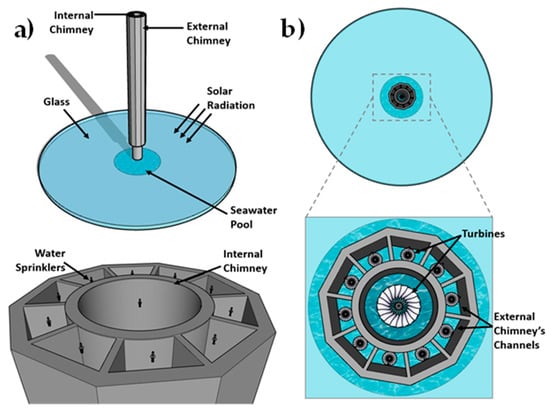 The structure of an HSDCPP mainly consisted of two chimneys (see Figure 1). The internal chimney with a collector, a bidirectional turbine, a base, and a pool of seawater to produce distilled water formed a traditional solar chimney (SCPP), while the external chimney, which was concentric with the internal chimney, performed as a cooling tower (CT).
