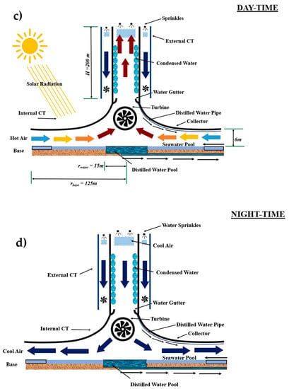 Typically, the SCPP and CT are usually constructed and operated separately. The SCPP operates during the daytime based on the solar irradiation received from the sun. The process begins when the solar irradiation heats up the collector, and the temperature of the air under the collector increases; when air temperature increases, its density decreases. As the air expands under the collector, it moves over the seawater pool. Meanwhile, the water evaporates and results in increasing air humidity. So, the hot and moist air moves up toward the chimney; the air temperature at the entrance of the collector is lower than the temperature at the bottom of the chimney. Due to the temperature and pressure difference between the bottom of and outside the chimney (at the vent at the top of the chimney, where the temperature is equal to air temperature), the hot air moves up from the bottom of the chimney to the top of the chimney and moves out of the system. As the hot air moves in the chimney, its velocity increases and exchanges energy with the turbine blades that are located at the bottom of the chimney and condensate on the chimney’s inner walls, producing electricity. However, CT does not depend on solar irradiation. Its operation is based on spraying a mist of water at the top of the chimney where the hot and dry air is. When the air absorbs the water from the mist, it becomes cooler and heavier. It is a natural draft CT; the air drops toward the bottom of the chimney due to gravity. In addition, due to the temperature difference between inside and outside the chimney, the air accelerates toward the turbine at the bottom of the chimney and exits outside the chimney, moving the turbine to produce electricity. The proposed system combined two system designs that were developed previously, the hybrid solar chimney power plants, HSCPP [41,42,43] and the solar double-chimney power plant (SDCPP) [44] The use of a bidirectional turbine that can move in both directions depending on the operation of the system was the key design parameter for the HSCPP as it enabled the system to operate as an SCPP during the day and becomes idle at night to enable the system to operate as a CT. This ensured electrical generation throughout the whole day. One other proposed modification (design) was adding a second chimney structure around the original chimney, which would operate as 10 cooling towers in series, where each tower would be equipped with a turbine and water sprinklers, allowing for higher energy production as it would be operating both day and night. This design offered higher utilization of the system as it made use of the daily operation of the SCPP and the day-night operation of the cooling towers, which did not rely on solar radiation, maximizing the efficiency of the electricity generation of the plant.