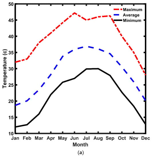 Maximum, minimum, and average monthly weather data profiles for (a) solar irradiation, (b) temperature, and (c) relative humidity. The data shown are a full year of weather conditions taken from the Doha International Airport in Qatar.