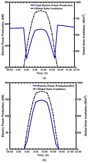 To sum up the operation of the proposed system, during the daytime, both the SCPP and external CT operated, while during the nighttime, both the CTs operated, resulting in high continuous power production throughout the whole day as shown in Figure 3a.