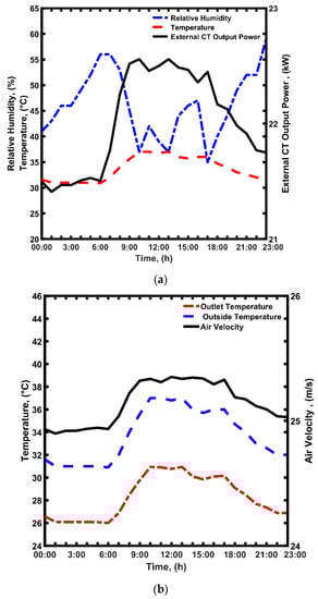As can be observed in Figure 4a, an indirect relationship can be concluded between the output power generated from the external cooling tower and the percentage of relative humidity (%RH) and/or the ambient temperature, making both the %RH and the ambient temperatures two parameters that affected the performance of the HSDCPP. From midnight until the beginning of the morning, from 24:00 until 06:00, the %RH increased from 41% to 56%; however, the ambient temperature decreased from 31.6 °C to 30.9 °C, and the insignificant increase in the ambient temperature led the output power to remain at 21.5 kW, despite the fluctuation of the power value during the time from 24:00 until 06:00. During the rest of the day, from 06:00 to 17:00, the %RH decreased from 56% to 35%, and the ambient temperature increased from 30.9 °C to 36 °C, causing the electrical output power to increase from 21.5 kW to 22.25 kW. However, the humidity fluctuation reflected directly on the electrical power produced. For example, the power production peaks (22.33 kW) at 10:00 and 13:00 correlated well with a low humidity value of 37%. However, the electricity production dropped down at 16:00, corresponding with the spike (47%) in the humidity. After dusk and during nighttime, the value of %RH increased from 35% to 59%, and the ambient temperature witnessed a drop from 36 °C to 32 °C; thus, the decline of the output electric power of the external CT was from 22.5 kW to 21.75 kW.