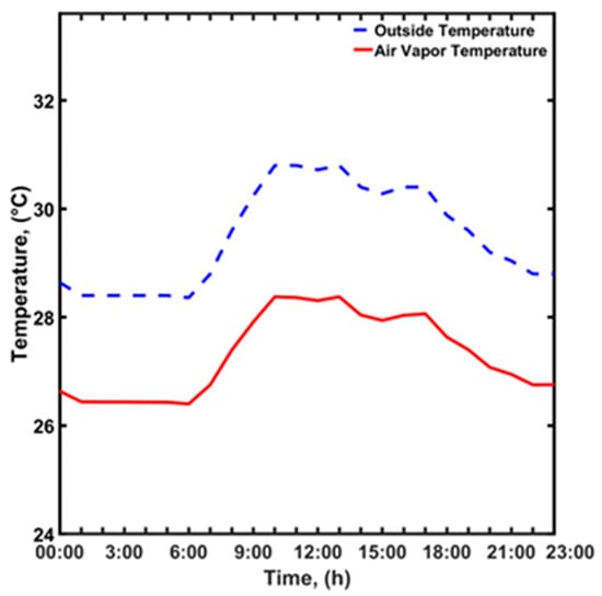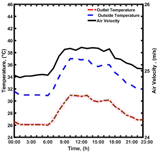 Both the outside air profile and the outlet air that exited from the bottom of the chimney profile had the same trend. However, due to the cooling effect inside the chimney, the inside air temperature levels were at lower values by 2 °C, as shown in Figure 7, when the internal chimney operated as a CT at nighttime.