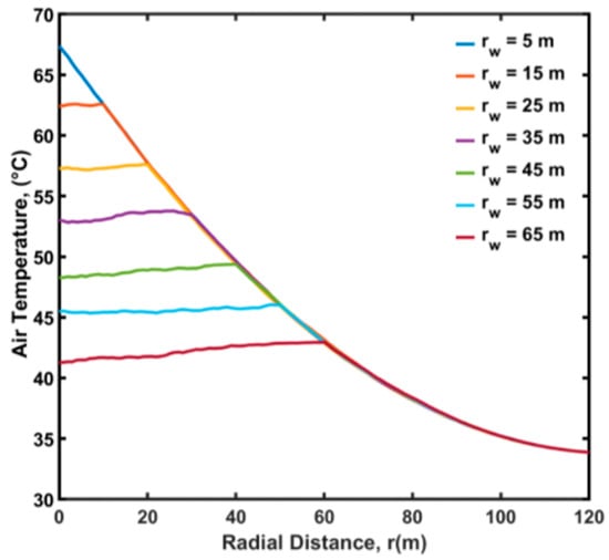 As seen in Figure 8, the temperature profile of the air under the collector was a function of the radial distance from the entrance to the solar chimney’s center. The reported air temperature inside the solar chimney showed an indirect relationship with the radius of the seawater pool (). Increasing the was accompanied by a significant decrease in the air temperature because the energy needed to evaporate the water increased. Increasing the air temperature, as previously mentioned, supported the hydrodynamic flow of air for electricity production. In other words, the had a direct effect on air temperature, thus increasing or decreasing the electrical power output.