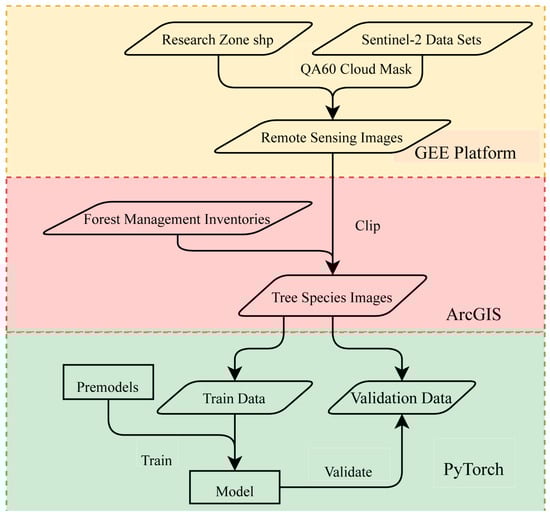 The study consisted of three primary steps (Figure 1): first, the Sentinel-2 images of the study area were processed and downloaded from the GEE platform; secondly, GGC was calculated by *.shp files of the domain tree species in forest management inventories, and sample images were clipped through GGC in ArcGIS 10.4 software; finally, the above images were trained and validated using deep learning algorithms with Pytorch.