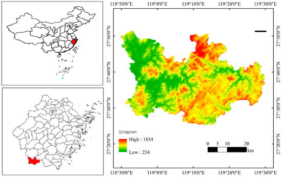 The study area of Qingyuan County is located in Zhejiang Province, which is in southeastern China. The geographical location is 118°50′–119°30′ E and 27°25′–27°51′ N, as shown in Figure 2. The county has a total area of 1898 km2, which spans 49 km from north to south and 67 km from east to west.