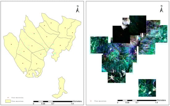 After downloading Sentinel-2 images from GEE, the center mass of the geographical location was calculated in ArcGIS 10.4. The main process is described as follows. Firstly, the .shp files of tree species were selected, which are described in Table 1, then the corresponding features were changed to points as the center of geographical location and images were clipped using a square with 64 × 64 pixels. An example of the above steps is described in Figure 3.