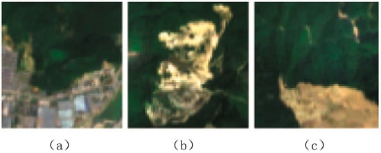 Examples for removing low-quality images from FTSD: (a) near the residential areas; (b) clouds covered; (c) large naked area.