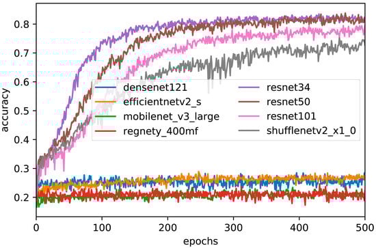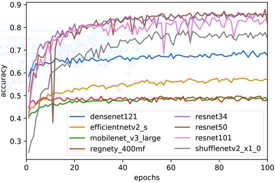 Many models showed a trend toward improved classification accuracy as epochs increased [42]. In deep learning and other machine learning methods, excessive training led to no help in improving validation classification accuracy because the testing data are overfitted to the training data. Overfitting was found after 200 epochs of training in Figure 5 and 50 epochs depicted in Figure 6. ResNet is a network-in-network architecture that relies on many stacked residual units [33]. Because of the usage of global average pooling rather than fully connected layers, it can obtain more accuracy by updating the residual module to use identity mappings. ResNet usually shows better results than other CNNs, which is also demonstrated in Figure 5 and Figure 6. The deeper the layers of the network, the higher accuracy the model achieves in the same dataset [43]. However, this was not the same as the result of our study. Figure 5 and Figure 6 show that ResNet34 and ResNet50 performed better than ResNet101, which has deeper layers of the network.