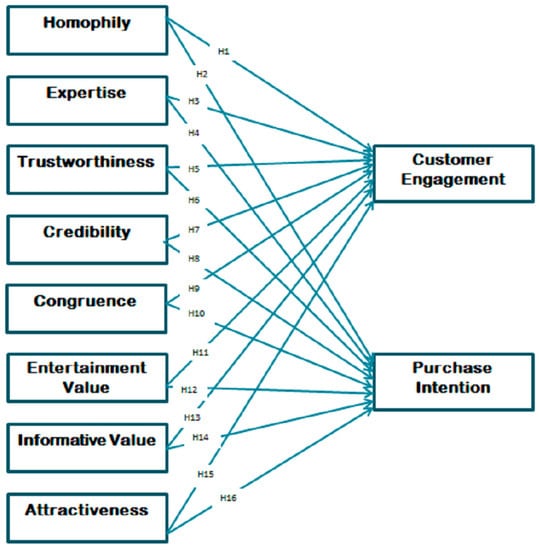 However, existing empirical research provides mixed results about the impact of the characteristics of social media influencers on purchase intention and customer engagement. Results are varied in terms of the strength of the relationship between the attributes of social media influencers and customer engagement and purchase intention. For instance, ref. [16] reported a low impact of expertise on customer engagement, while [17] found a high impact of expertise on customer engagement. Similarly, Shan et al. [18] found a negative impact of homophily on purchase intention, while Shen et al. [19] concluded a positive and high correlation between homophily and purchase intention. Thus, despite an enormous number of studies, researchers have reached no consensus on the relationship between the characteristics of social media influencers and customer engagement and purchase intention.