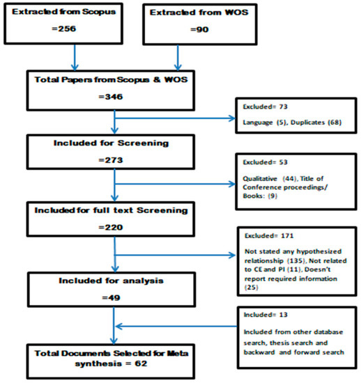 The meta-analysis method of reviewing the literature is utilized in the current study. It is applied to summarize the findings of several empirical studies by employing an effect size measure, like the correlation coefficient, and then combining these measures [48]. The use of meta-analysis in this study is justified for the following reasons. It is a technique that, in the first place, statistically summarizes the earlier research on various relationships. By collecting and analyzing the quantitative findings of numerous empirical studies, it provides the ability to evaluate the full picture from a research perspective. It not only determines whether a relationship exists but also assesses whether the effect is positive or negative. In addition, it examines potential moderators that evolved through logical thinking and accepted theory and gives stronger statistical power by pooling the results of multiple quantitative research studies and avoiding the statistical limits of a single study. It helps in overcoming the problem of a small sample size and provides greater accuracy because it evaluates numerous research publications in the same domain. Furthermore, it generates new hypotheses which were not posed by individual studies and inspires future studies.