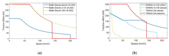 Effort characteristics of different vehicles considered for simulation (null values indicate that the locomotive/unit cannot reach this speed): (a) Tractive effort for conventional locomotives (manufactured or rebuilt from 1992 to 2020), (b) Tractive effort for locomotives with “Last Mile” options by Bombardier, TRAXX LM (freight version, in service in EU equipped with a small diesel unit) and for a dual hybrid diesel and electric multiple unit (DHEMU) by Patentes Talgo S.A, Spain.