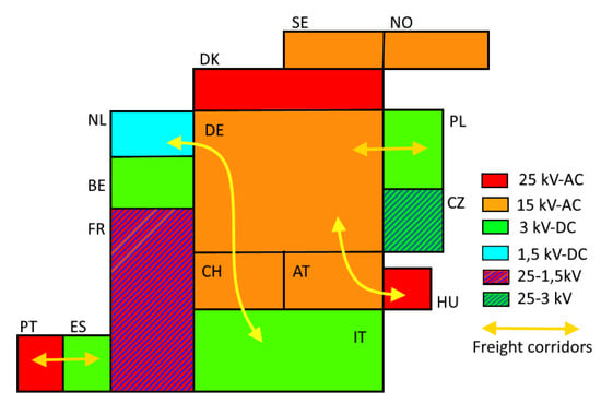 Nominal voltage in overhead railway systems (catenary) in main European countries and some examples of freight corridors (yellow arrows) that justify the use of diesel-electric units for some passenger and freight services.